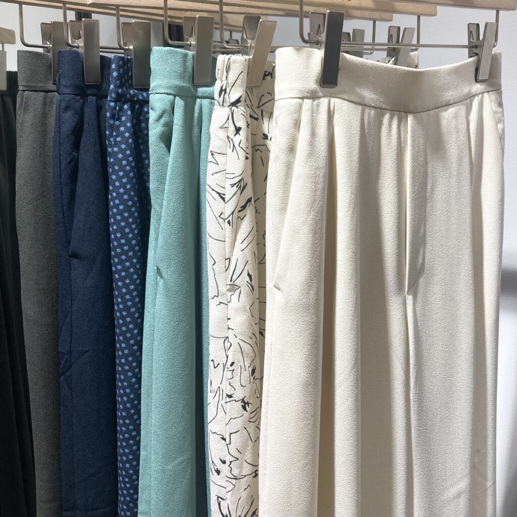 広がり過ぎないシルエットで、カジュアルにもキレイめにも合わせやすいパンツです。