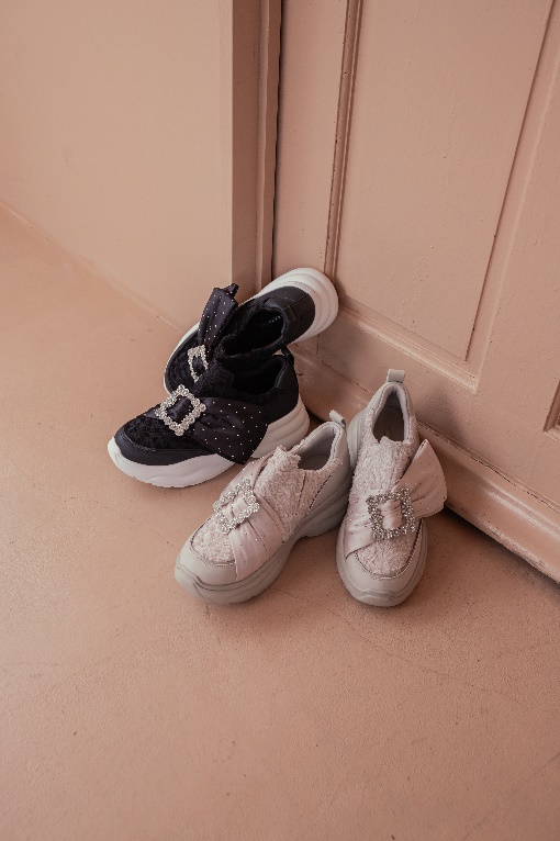 ビックリボンと煌びやかなビジューバックルがレディムード漂うスニーカー。