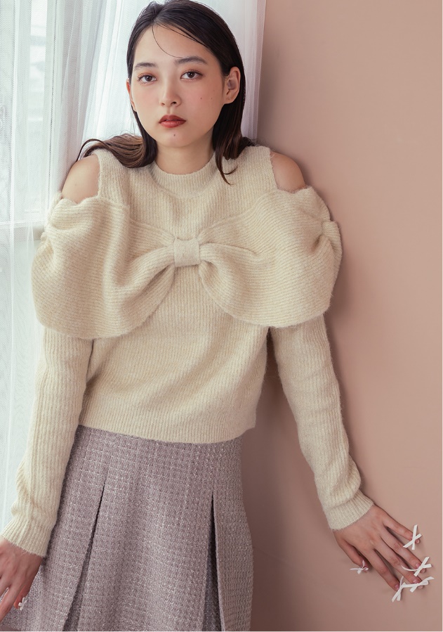 トレンドのリボンディティールで女性らしさを感じさせるデザインニット。