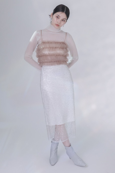 スクエアトゥとプレートヒールでモードな雰囲気を出しつつ、リボンディティールでフェミニンムードもプラス。柔らかい繊細な小粒グリッターが上品な印象を与えます。