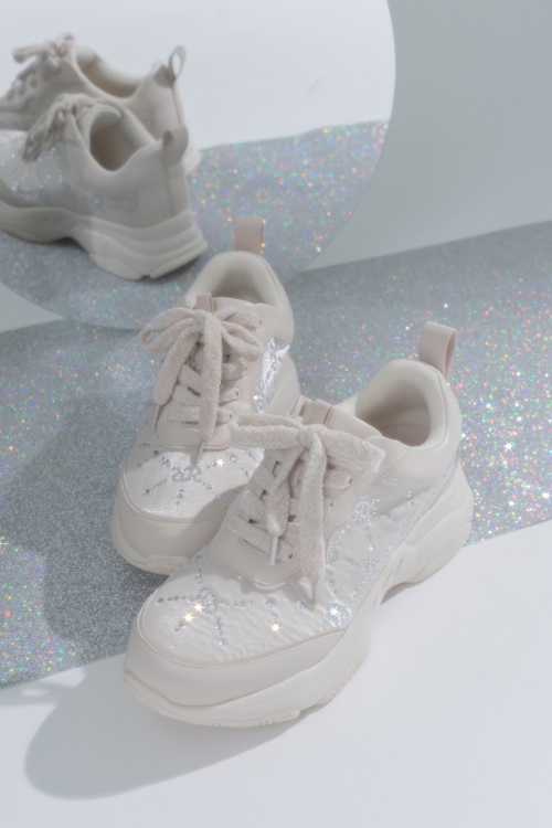 ボリュームソールを採用しカジュアルさを取り入れつつ、きらりと輝くホットフィックスストーンでフェミニンムードもプラスしたRANDAらしい1足。