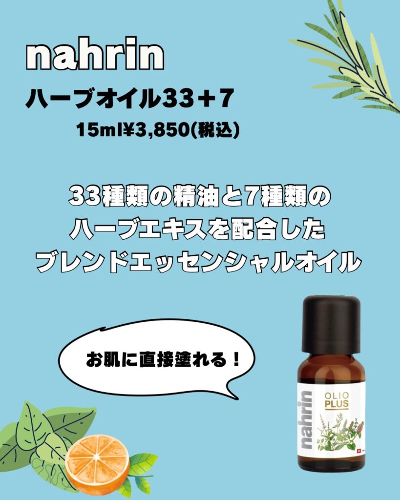 ナリンの人気アイテム「ハーブオイル33+7」は、33種類の精油と7種類のハーブエキスをブレンドしたエッセンシャルオイルです🇨🇭