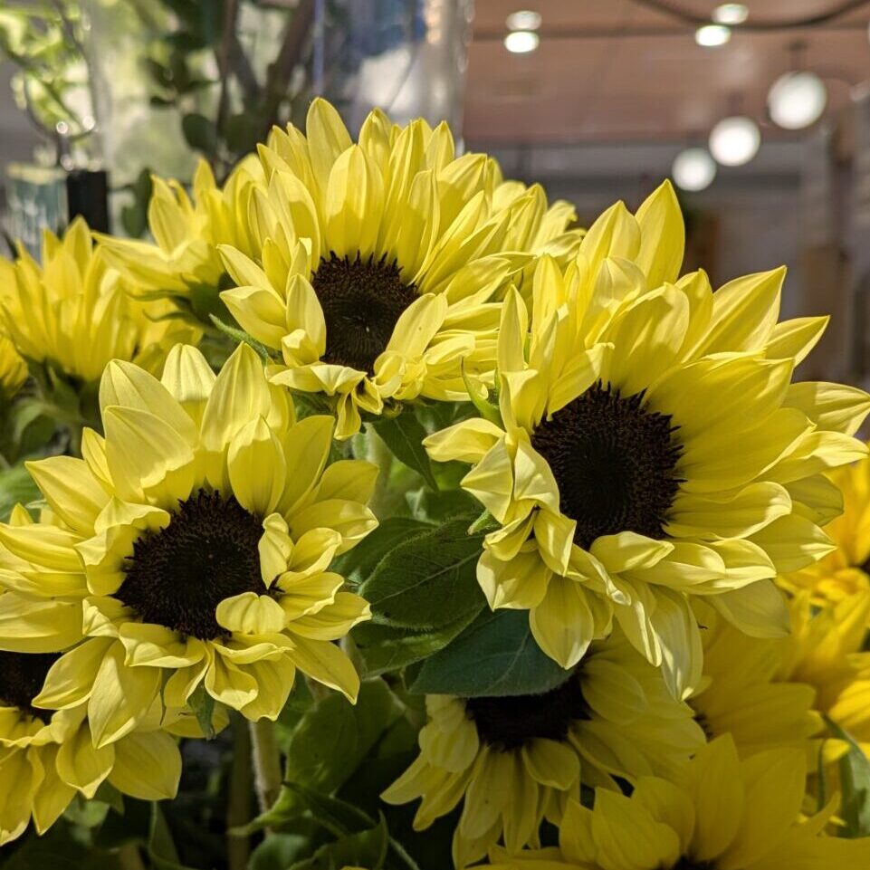 ナチュラルな雰囲気にしたいときは、淡いイエローのヒマワリに枝ものや葉ものを、
