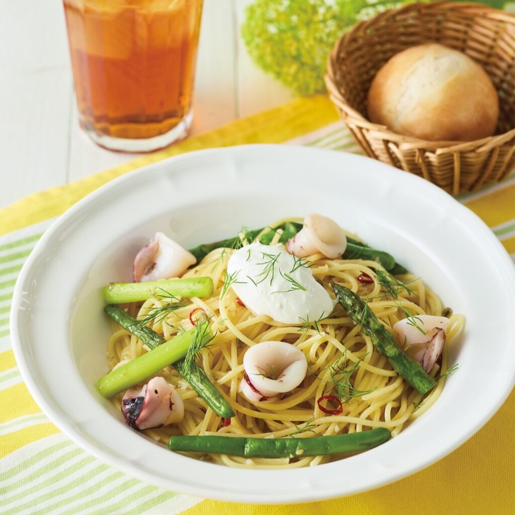 やわらかな食感の剣先イカ、アスパラガス、インゲンを、魚介と香味野菜を煮だしたソースで仕上げたペペロンチーノ。レモンサワークリームを添えて。