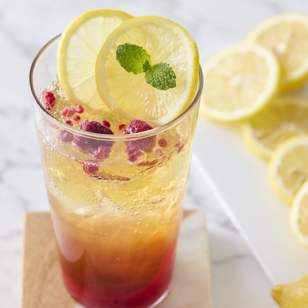 ライチベリーアッサムティーに、レモンとラズベリーのソース、カモミールティーのジュレを重ねた、微炭酸のフルーツエードティー。